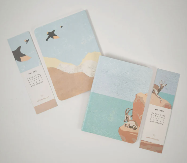 מארז ובו זוג מחברות כיס תפורות (A6) המאוירות בדוגמאות מרקמים ונופים מהטבע המדברי של הנגב וים המלח.